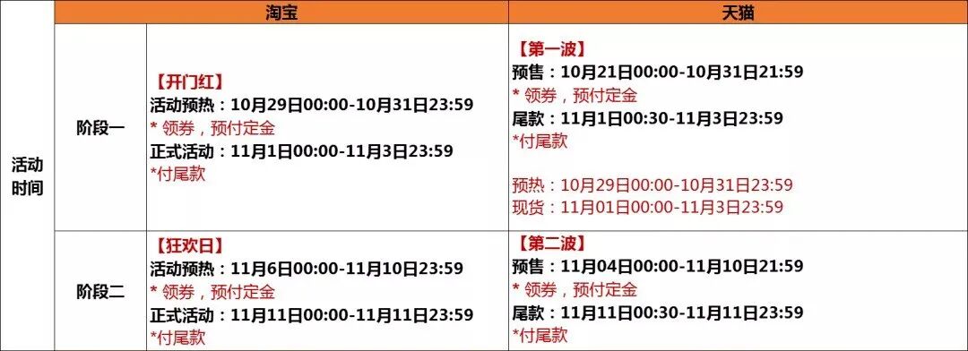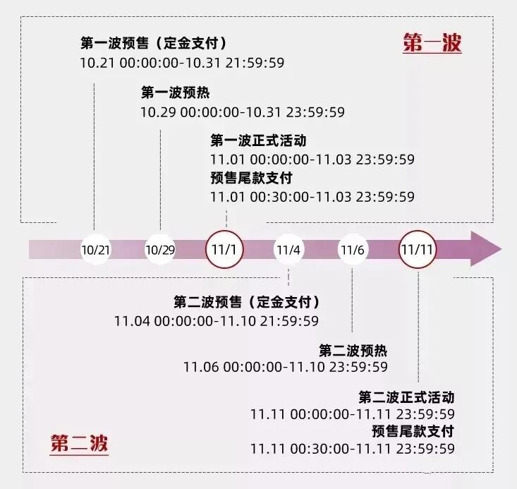 1、淘宝11.11两次爆发:淘宝11.11“开门红”和”狂欢日”;