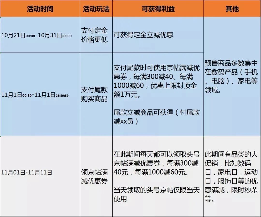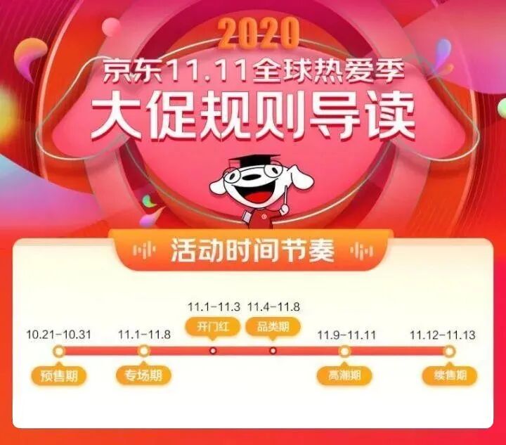 今年京东11.11活动整体分为四个时期,第一时期为“预售期”,第二时期为“专场期”,第三时期为“高潮期”,第四时期为“续售期”。